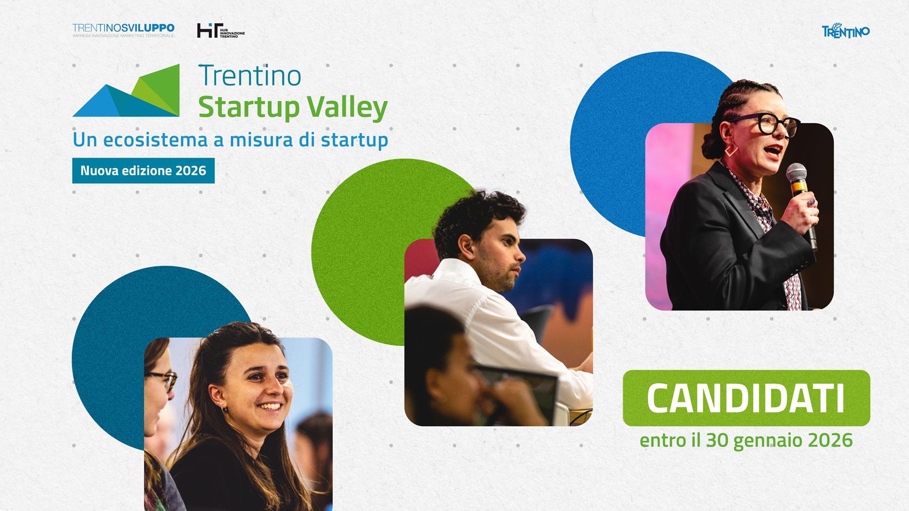 Alla settima edizione di Trentino Startup Valley potranno accedere singoli, gruppi di almeno due persone fisiche non ancora costituite in impresa e imprese costituite a partire dal 1° settembre 2024. I termini per candidarsi scadono il 30 gennaio 2026. Info e iscrizioni su: www.trentinostartupvalley.it