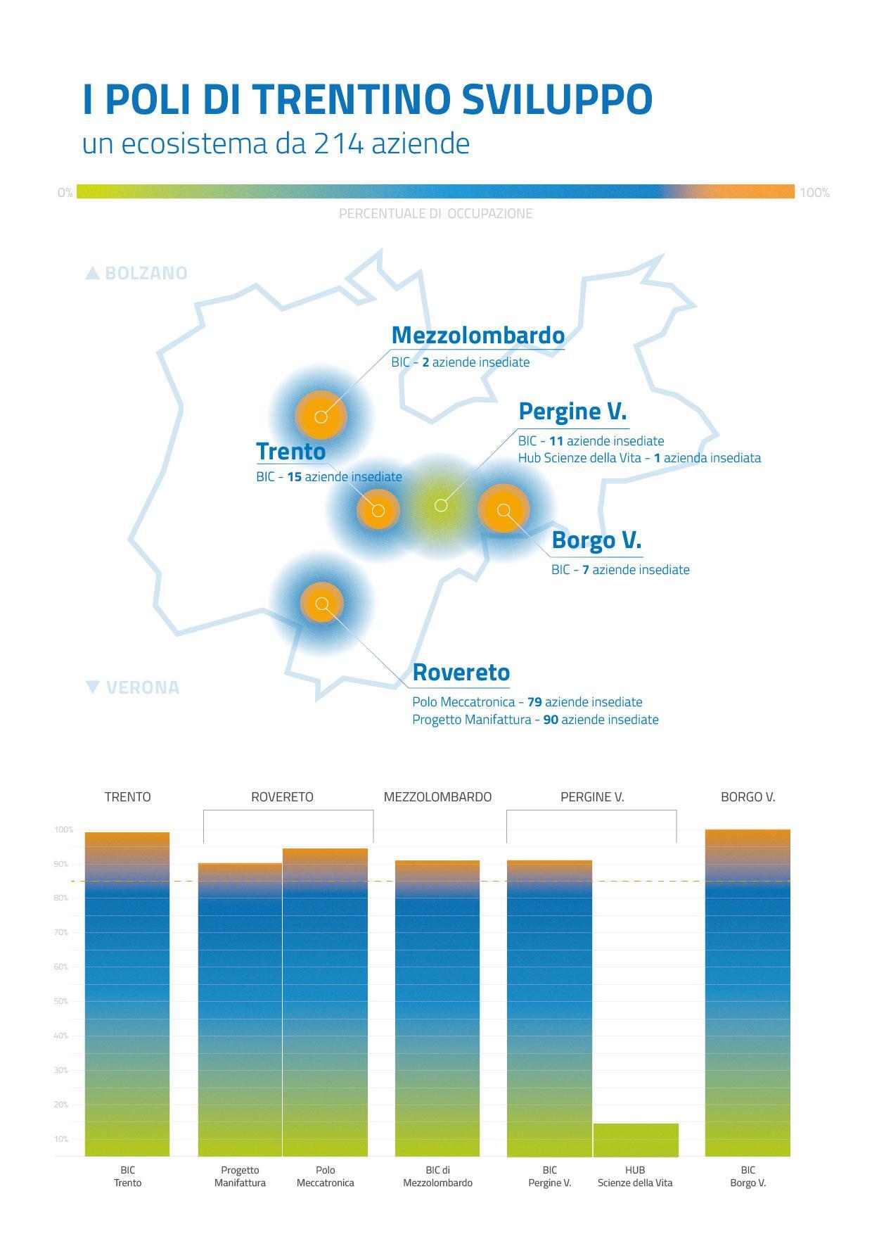 Ad oggi, gli incubatori di Trentino Sviluppo sono quasi al completo. Nel BIC di Borgo Valsugana – sia i moduli produttivi che gli spazi ad uso ufficio sono interamente occupati – per un totale di 7 aziende insediate. Anche il Polo Tecnologico di Trento è quasi interamente occupato, con 15 realtà insediate e un solo modulo ad uso ufficio libero. Il BIC di Pergine Valsugana e il BIC di Mezzolombardo sono saturi al 92% e hanno ancora poche disponibilità di spazi ad uso ufficio.