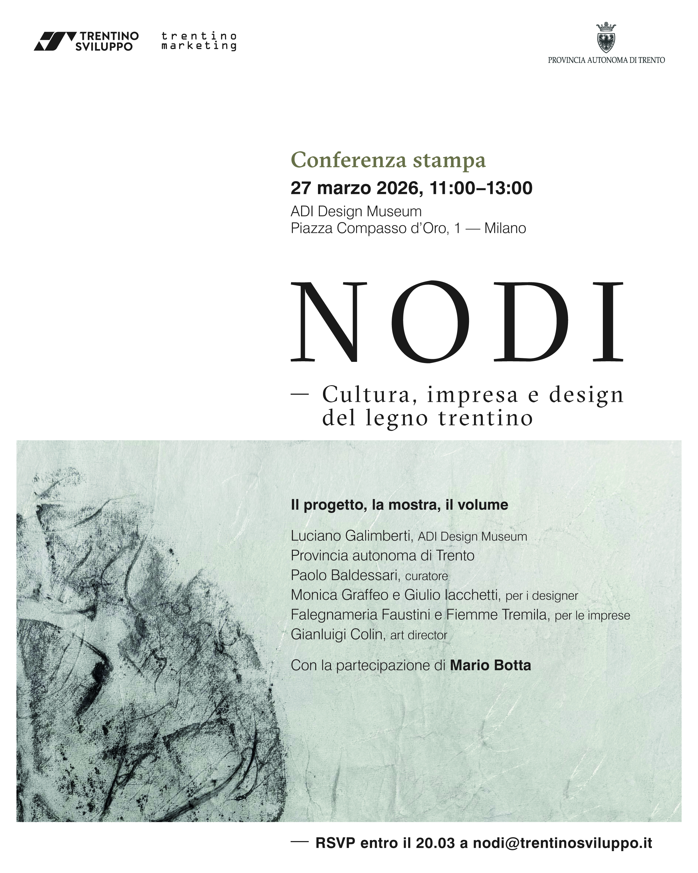 NODI. Cultura, impresa e design del legno trentino è un progetto promosso dalla Provincia autonoma di Trento e coordinato da Trentino Sviluppo in collaborazione con Trentino Marketing, con la curatela di Paolo Baldessari e Aldo Colonetti. Ha l’obiettivo di valorizzare e stimolare l’internazionalizzazione del legno trentino. Un percorso della durata di un anno avviato nel 2025 e sviluppato attraverso un lavoro condiviso tra quindici imprese artigiane e industriali locali e altrettanti designer di rilievo nazionale e internazionale, che culminerà in una mostra di progetti all’ADI Design Museum disponibile al pubblico dal 28 marzo al 12 aprile 2026. La partecipazione all’inaugurazione, in programma il giorno precedente alle ore 18, è solo su invito.