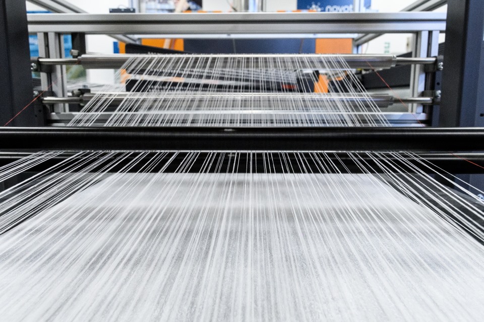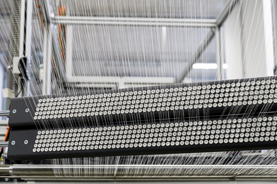 L'impianto, ormai prossimo alla partenza per l’Olanda, è lungo quasi 15 metri e al suo interno avvengono processi di precisione straordinaria: 800 fibre vengono intrecciate simultaneamente per dare vita a un tessuto tecnico largo 60 centimetri. L’operazione si ripete incessantemente a una velocità di 20 metri al minuto, il che significa che in una giornata lavorativa standard l’impianto produce oltre 9 chilometri di tessuto. Un particolare sistema di controllo ottico, che scansiona il tessuto 200 volte al secondo, si accerta infine che ogni centimetro prodotto rispetti gli standard richiesti prima di essere avvolto in bobina.