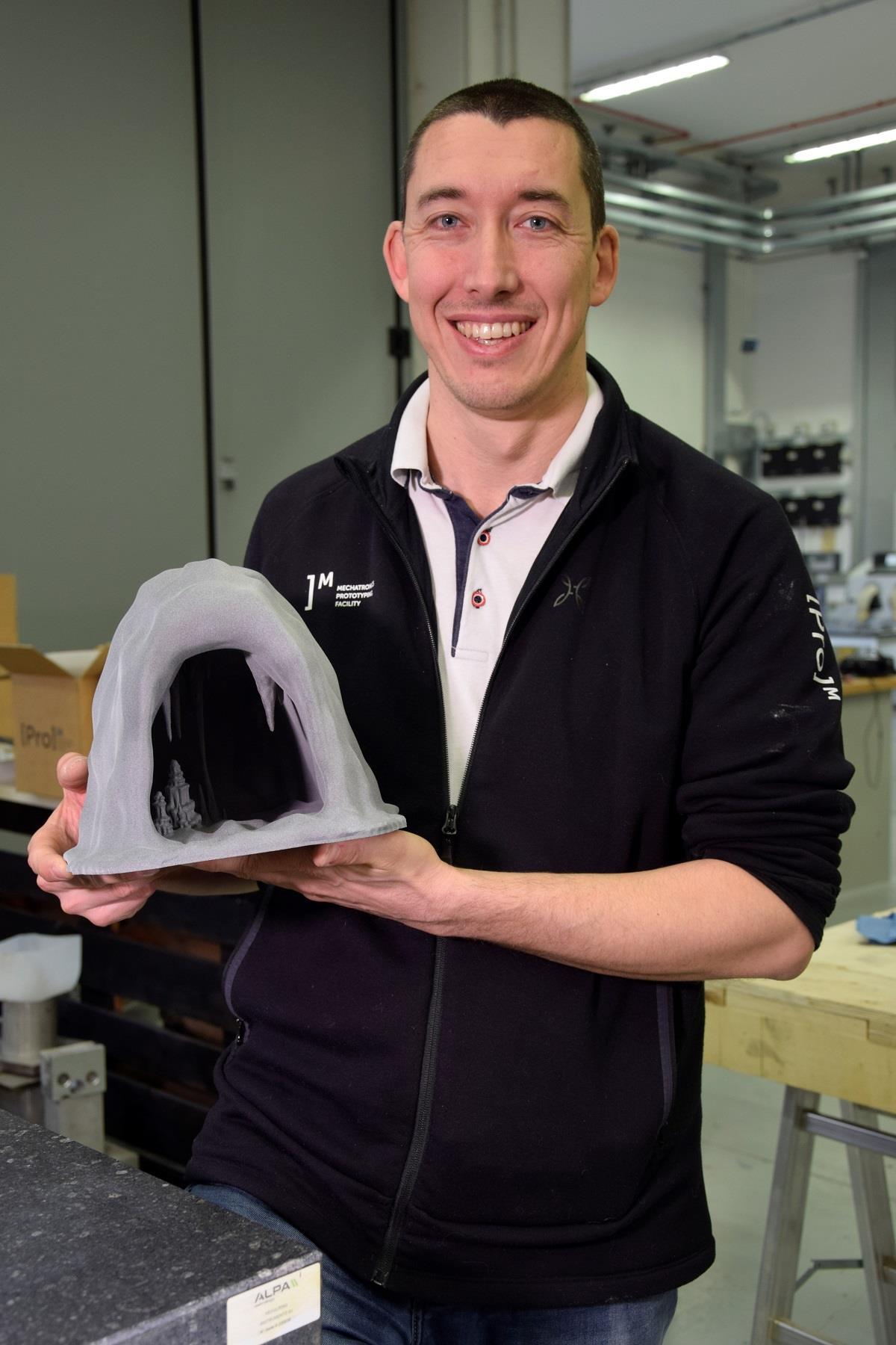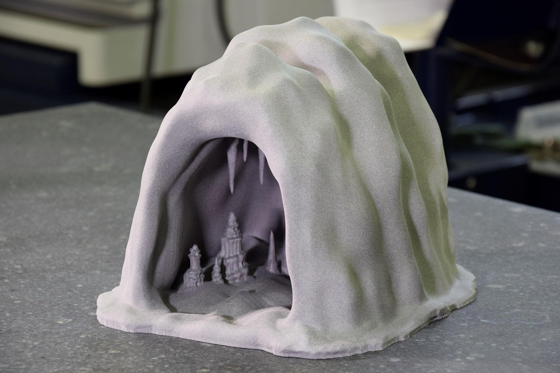 «Il modello, stampato con dimensioni adatte alle mani di un bambino ed arricchito di particolari che mostrano varie conformazioni rocciose – sottolinea Matteo Perini, tecnico di ProM Facility – è stato realizzato in Poliammide 12, un materiale certificato per il contatto con la pelle. La poliammide garantisce un buon livello di dettaglio, che il tatto allenato degli alunni ipovedenti saprà cogliere, ma anche la solidità della struttura, elemento chiave visto che la grotta passerà di mano in mano tra i bambini delle diverse classi durante la lettura del libro».